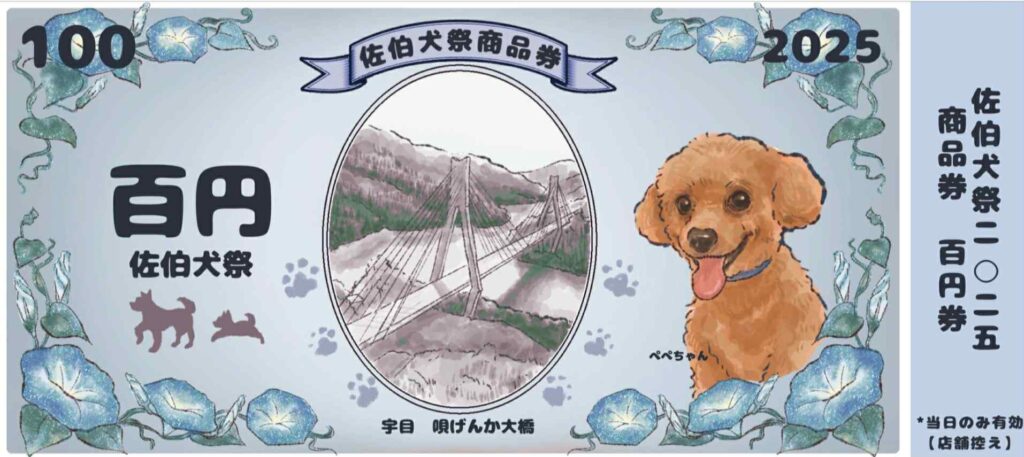 待て競争、おいで競争、ラケットリレーの勝者、抽選会の当選者に配布される佐伯犬祭 2024 当日のみに使える商品券です。